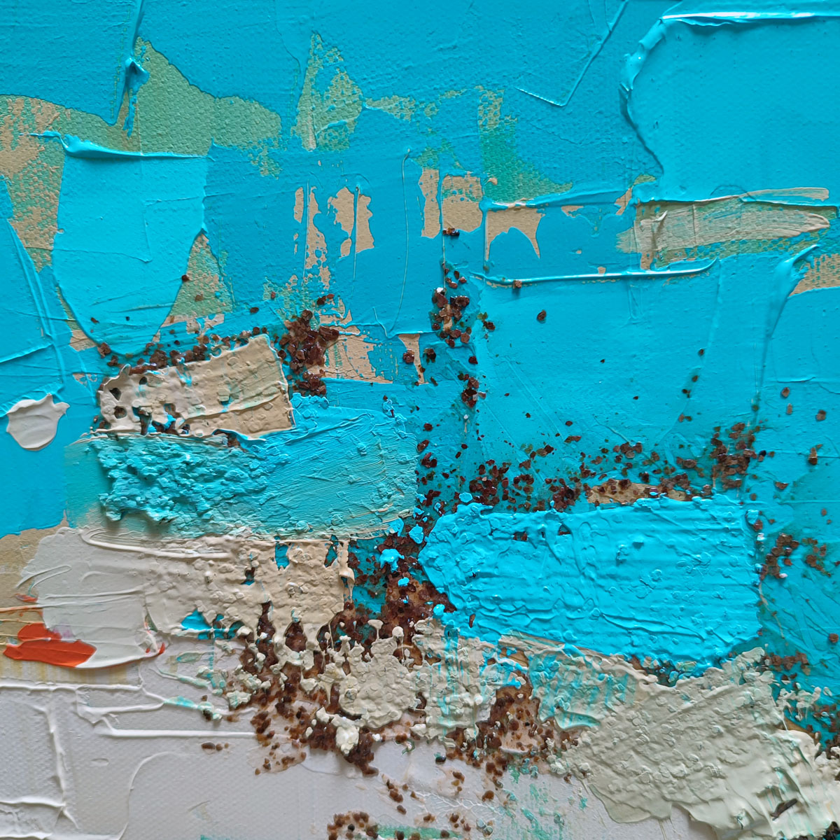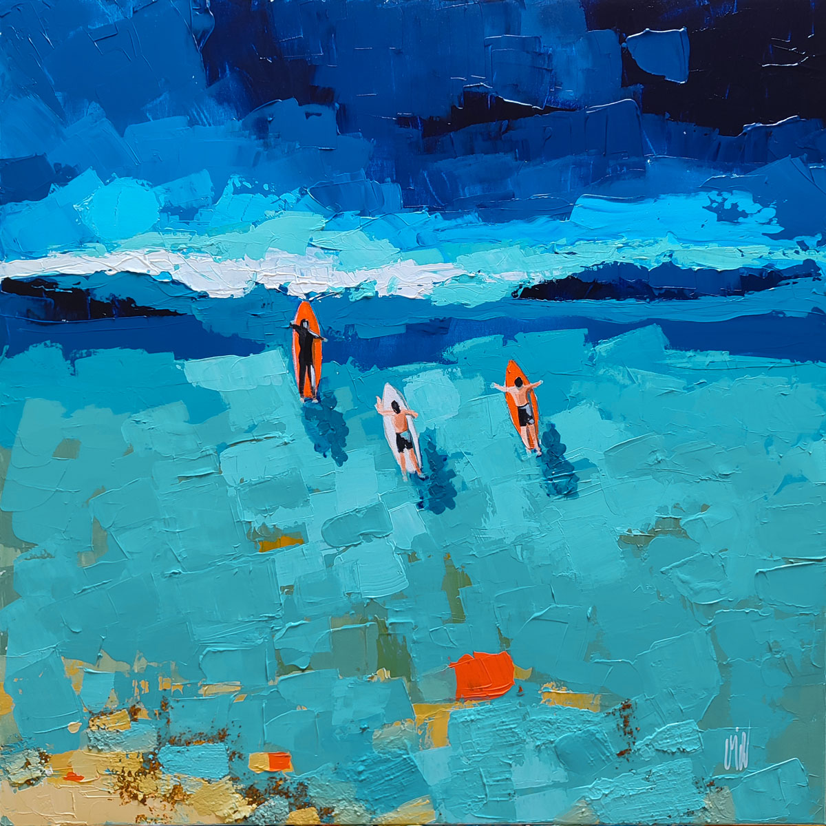 Départ sur le reef : scène marine en impasto: des bleus antraquinone, cyan et turquoise, épais comme des vagues sculptées. Trois surfeurs qui vibrent au cœur du paysage. La texture généreuse et les blocs de couleur créent un écart entre sérénité et mouvement. C’est l’océan, senti et capté dans l’instant, à la fois calme et électrique. En bas de la toile une texture micassée qui fait ressentir le sable et les roches.