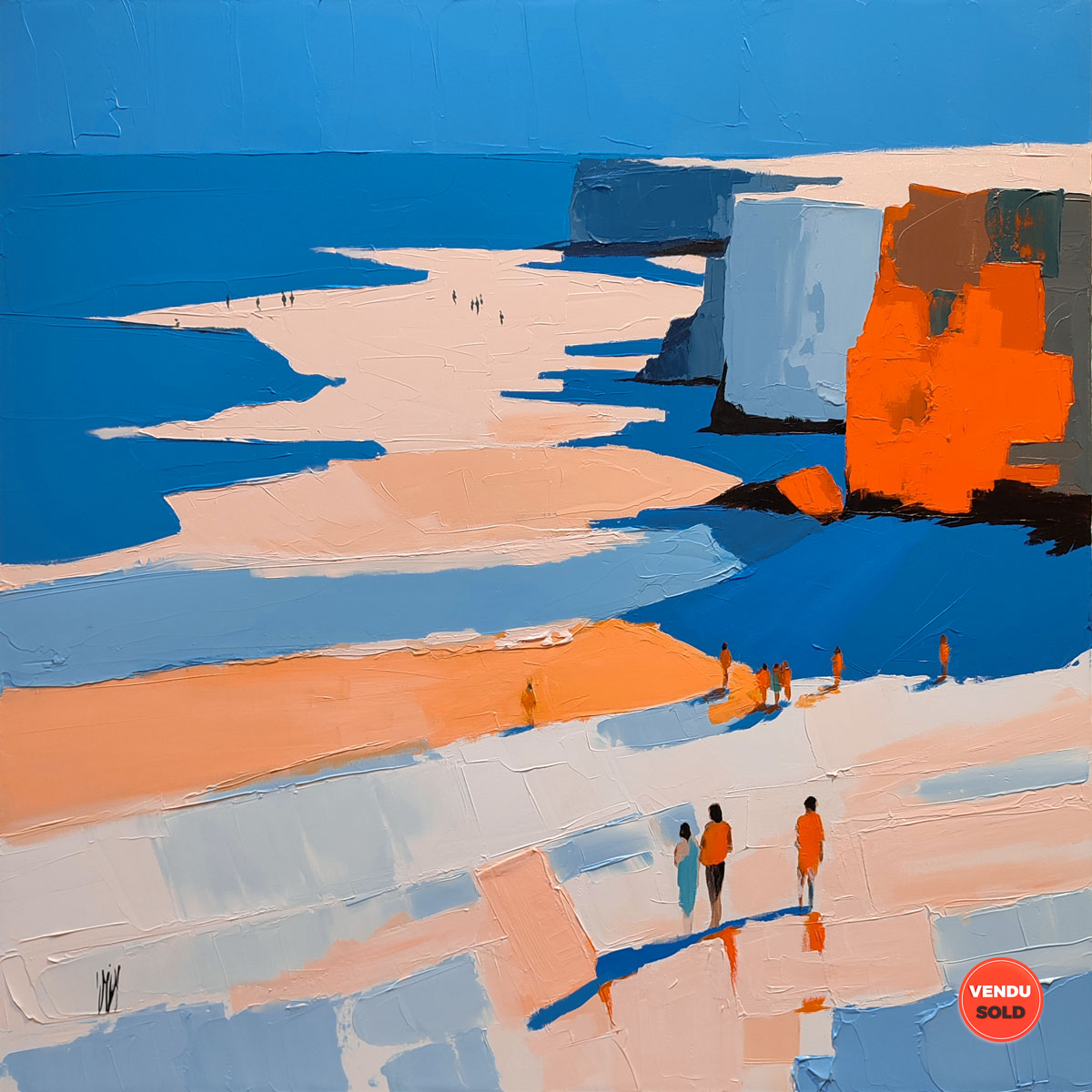 L’air chaud est lourd en cette fin de journée. Sous les pieds nus, le sable irradie, chaque grain est une braise qui pulse dans la chair. La falaise râpe la paume : tiède, vivante, vibrante de lumière. L’eau frappe enfin : un froid métallique qui cingle les jambes, contraste avec la chaleur. Le corps frissonne, enveloppé d’une lumière épaisse qu’on touche presque.