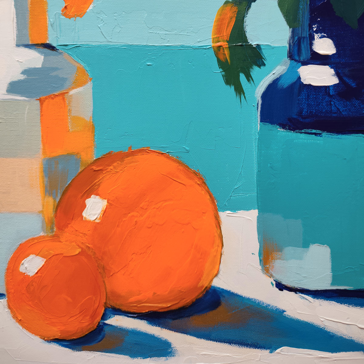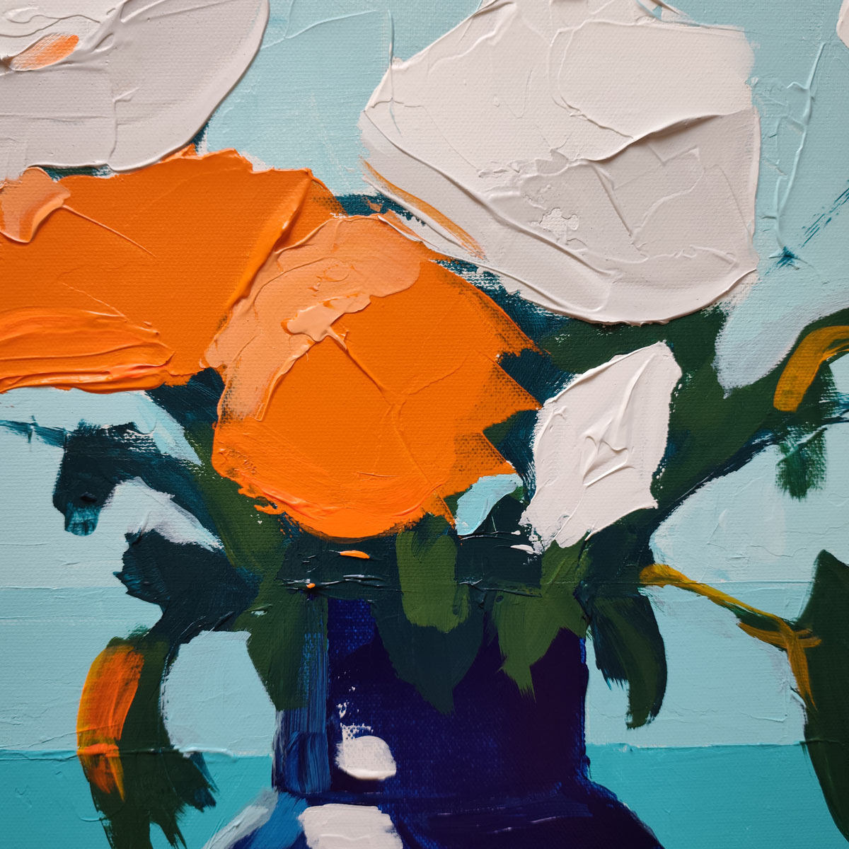« Fleurs d’été » : explosion joyeuse de fleurs orange vif et de roses blanches dans un vase bleu, posée sur un rebord lumineux face à l’horizon turquoise infini de la mer. Une orange et une mandarine ajoutent leur éclat solaire à cette nature morte estivale. Le contraste danse avec une texture vibrante de peinture appliquée au couteau et une lumière vive qui invite au bonheur des jours ensoleillés.