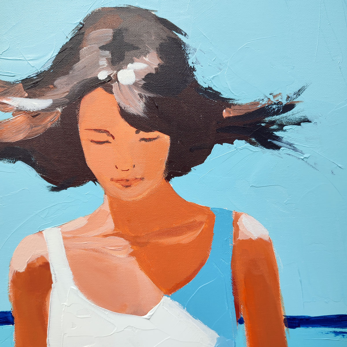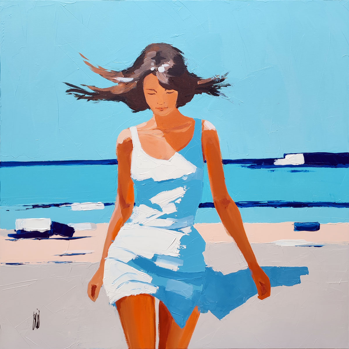 Une fille avance pieds nus sur le sable tiède, cheveux fouettés par le vent salé, robe légère collée à sa peau dorée par le soleil. Entre ciel et mer turquoise, elle incarne un instant de liberté pure. L’Océan lui murmure des secrets qu’elle seule entend.