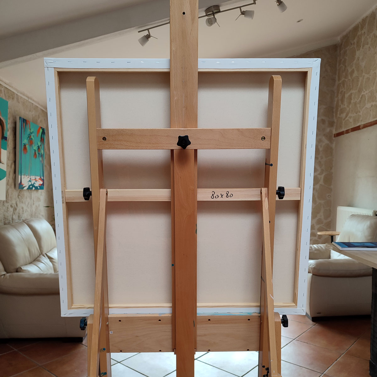 La texture généreuse de la peinture à donne vie à leurs peaux cuivrées et à l’eau miroitante qui reflète leurs silhouettes. Une scène intime et lumineuse, pleine de calme et de modernité.