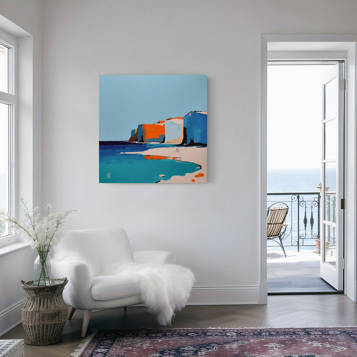 « Plage au creux des falaises », une œuvre minimaliste évoquant une plage nichée au pied de hautes falaises, illuminées d’éclats orange vif et clair. Un style moderne,  pour l’art du paysage de littoral contemporain évoquant la tension verticale et le silence marin d’une plage calme aux eaux tranquilles .