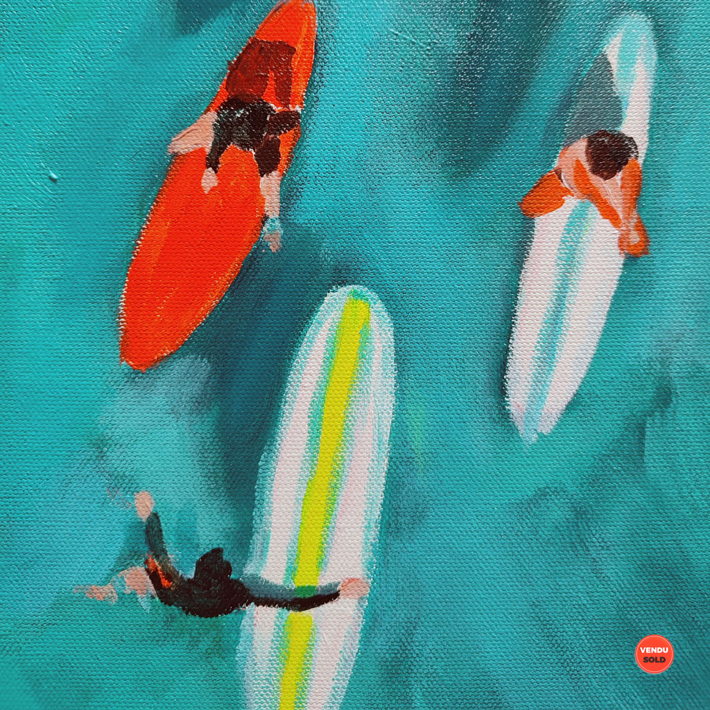 Chaque détail, chaque touche de pinceau, vise à capturer l’instant précis où l’excitation et la sérénité se rencontrent. Les postures attentives des surfeurs, scrutant l’horizon avec une anticipation tangible, ajoutent une dimension humaine à la scène, renforçant le lien avec la mer.