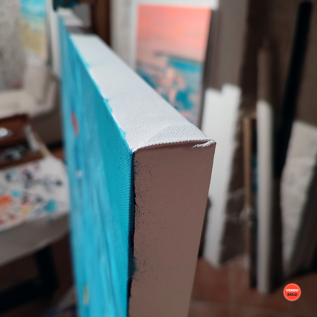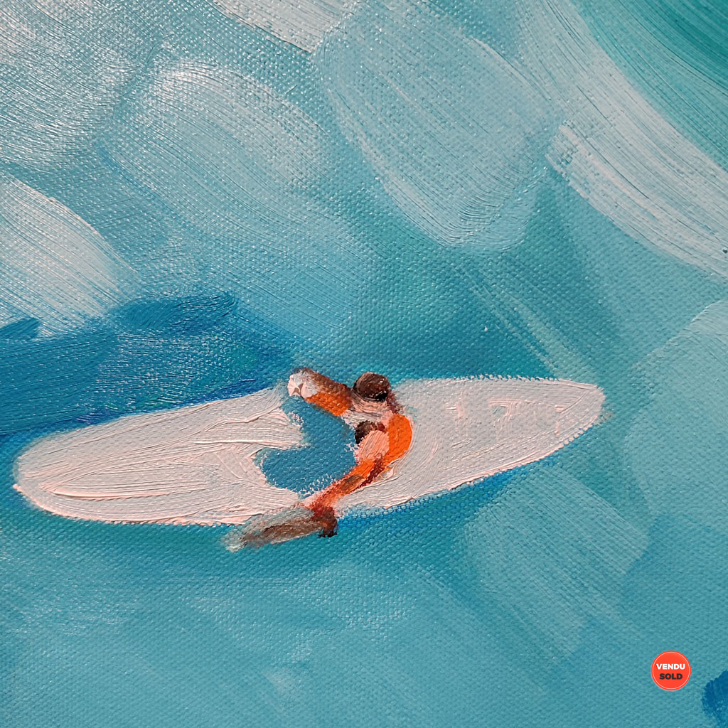 Dans cette toile « Surf en été », j’ai choisi de représenter une perspective aérienne capturant des surfeurs en attente, assis sur leurs planches dans une mer turquoise et calme. La vue du dessus offre une vision unique de l’océan, révélant les formes des surfeurs flottant paisiblement, leurs planches à la dérive.