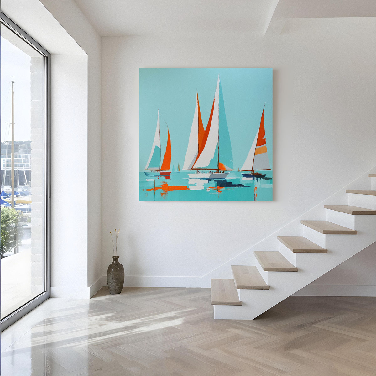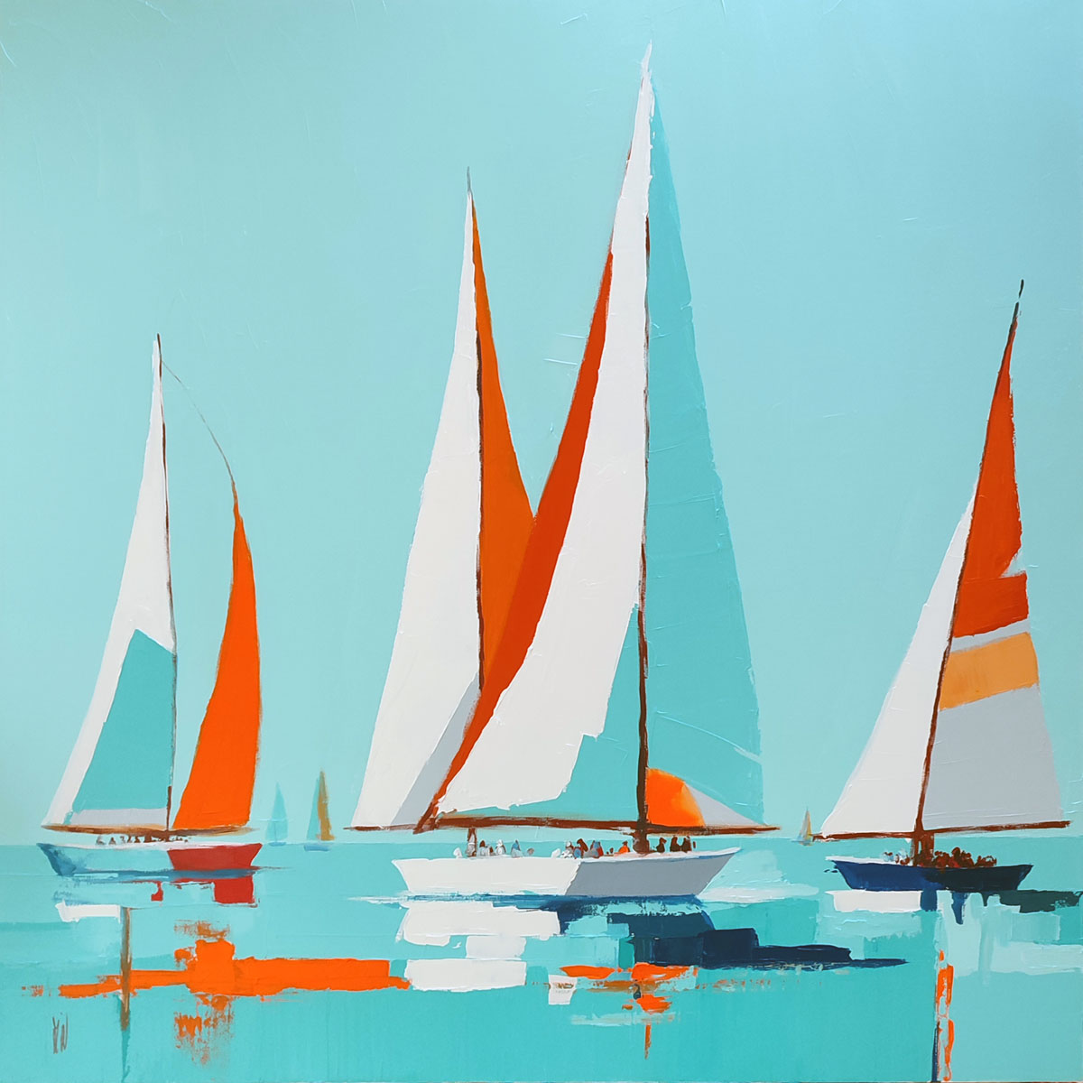 Une composition minimaliste représentant des voiliers glissant sur un océan calme,